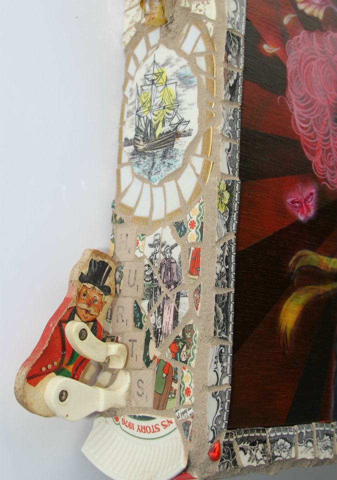 I will have two new pieces presented in custom made mosaic frames in a group show titled OBJET TROUVE' at The Potter's Wife Gallery. I had so much fun creating these obnoxious frames from found vintage objects. Thanks to my husband who helped me by building the raw frames out of wood, that I got to make a big mess of! It was a time consuming under taking, and something I have been wanting to do for years, and I completely enjoyed it. I plan to do more in the near future. Here are the two pieces for that show and the event flyer below. If you are interested in a closer look at these, as in hanging them on your wall at home, contact the friendly folks over at the Potters Wife Gallery for prices.